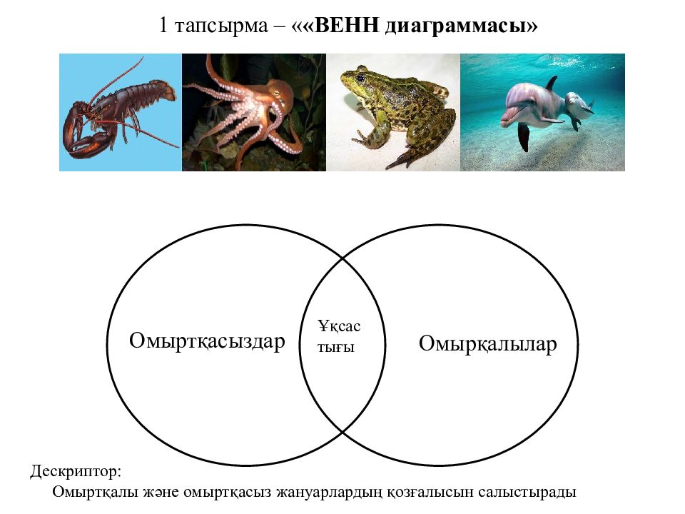 1 тапсырма – « «ВЕНН диаграммасы» Омыртқасыздар Омырқалылар Ұқсастығы Дескриптор: Омыртқалы және омыртқасыз жануарлардың қозғалысын салыстырады