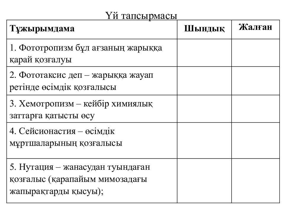 Тұжырымдама Шындық Жалған 1. Фототропизм бұл ағзаның жарыққа қарай қозғалуы 2. Фототаксис деп – жарыққа жауап ретінде өсімдік қозғалысы 3. Хемотропизм – кейбір химиялық заттарға қатысты өсу 4. Сейсионастия – өсімдік мұртшаларының қозғалысы 5. Нутация – жанасудан туындаған қозғалыс (қарапайым мимозадағы жапырақтарды қысуы);