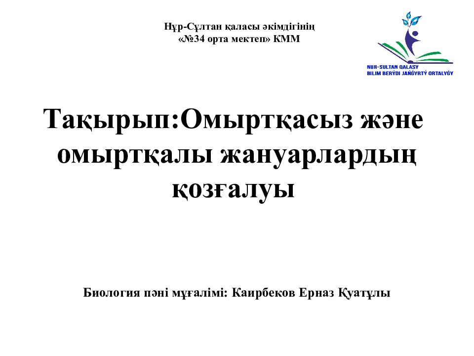 Тақырып:Омыртқасыз және омыртқалы жануарлардың қозғалуы Биология пәні мұғалімі: Каирбеков Ерназ Қуатұлы Нұр-Сұлтан қаласы әкімдігінің «№34 орта мектеп» КММ