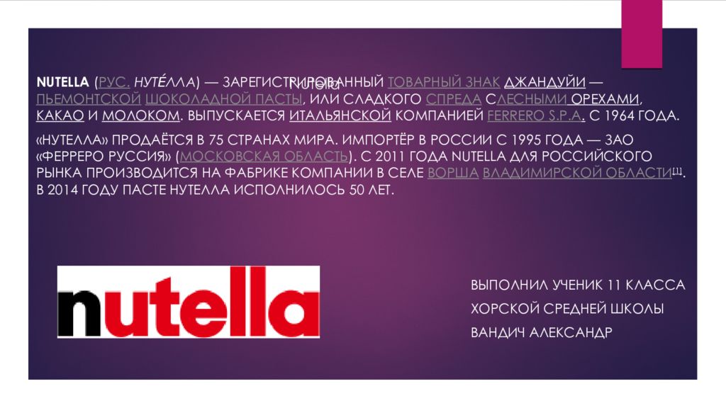 Nutella ( рус. Нуте́лла ) — зарегистрированный товарный знак джандуйи — пьемонтской шоколадной пасты, или сладкого спреда с лесными орехами, какао и молоком. Выпускается итальянской компанией Ferrero S.p.A. с 1964 года. « Нутелла » продаётся в 75 странах мира. Импортёр в России с 1995 года — ЗАО «Ферреро Руссия » ( Московская область ). C 2011 года Nutella для российского рынка производится на фабрике компании в селе Ворша Владимирской области [1]. В 2014 году пасте Нутелла исполнилось 50 лет. Выполнил ученик 11 класса Хорской средней школы Вандич александр