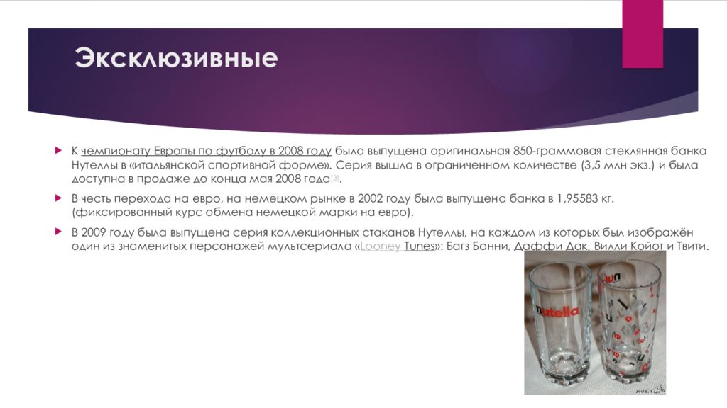 К чемпионату Европы по футболу в 2008 году была выпущена оригинальная 850-граммовая стеклянная банка Нутеллы в «итальянской спортивной форме». Серия вышла в ограниченном количестве (3,5 млн экз.) и была доступна в продаже до конца мая 2008 года [3]. В честь перехода на евро, на немецком рынке в 2002 году была выпущена банка в 1,95583 кг. (фиксированный курс обмена немецкой марки на евро). В 2009 году была выпущена серия коллекционных стаканов Нутеллы, на каждом из которых был изображён один из знаменитых персонажей мультсериала « Looney Tunes »: Багз Банни, Даффи Дак, Вилли Койот и Твити.