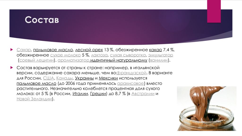 Сахар, пальмовое масло, лесной орех 13 %, обезжиренное какао 7,4 %, обезжиренное сухое молоко 5 %, лактоза, сухая сыворотка, эмульгатор ( соевый лецитин ), ароматизатор идентичный натуральному ( ванилин ). Состав варьируется от страны к стране: например, в итальянской версии, содержание сахара меньше, чем во французской. В варианте для России, США, Канады, Украины и Мексики используется пальмовое масло (до 2006 года применялось арахисовое ) вместо растительного. Незначительно колеблется процентная доля сухого молока: от 5 % (в России, Италии, Греции ) до 8,7 % (в Австралии и Новой Зеландии ).