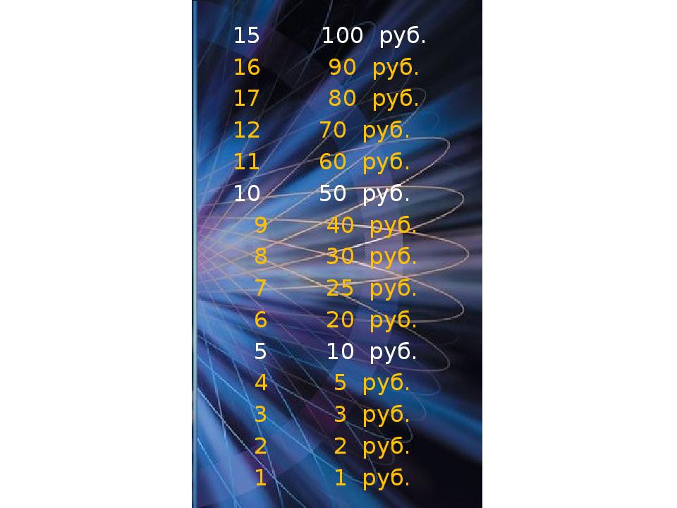 100 руб. 90 руб. 80 руб. 12 70 руб. 11 60 руб. 10 50 руб. 9 40 руб. 8 30 руб. 7 25 руб. 6 20 руб. 5 10 руб. 4 5 руб. 3 3 руб. 2 2 руб. 1 1 руб.