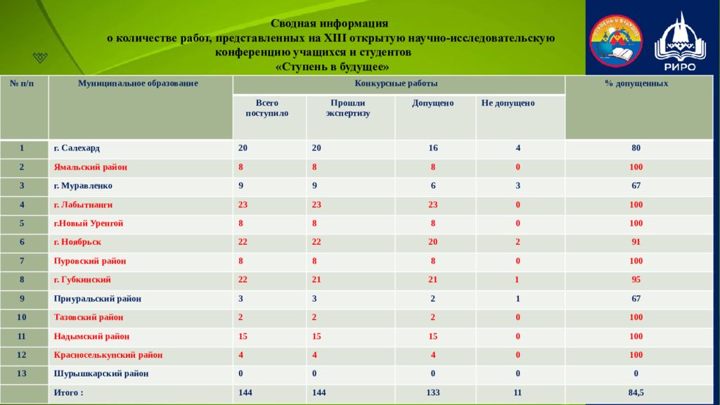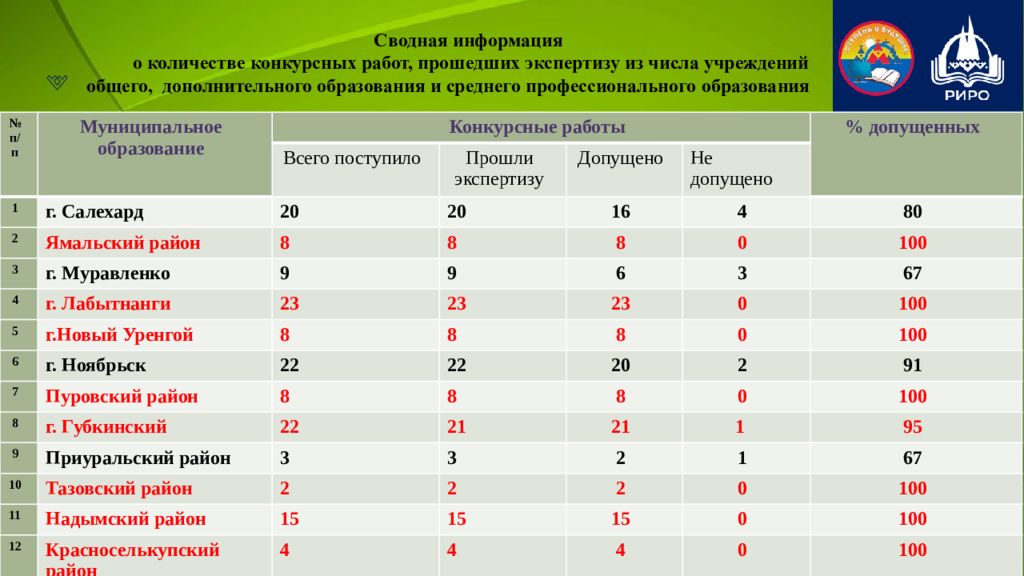 Сводная информация о количестве конкурсных работ, прошедших экспертизу из числа учреждений общего, дополнительного образования и среднего профессионального образования № п/п Муниципальное образование Конкурсные работы % допущенных Всего поступило Прошли экспертизу Допущено Не допущено 1 г. Салехард 2 0 20 16 4 80 2 Ямальский район 8 8 8 0 100 3 г. Муравленко 9 9 6 3 67 4 г. Лабытнанги 23 23 23 0 100 5 г.Новый Уренгой 8 8 8 0 100 6 г. Ноябрьск 22 22 20 2 91 7 Пуровский район 8 8 8 0 100 8 г. Губкинский 22 21 21 1 95 9 Приуральский район 3 3 2 1 67 10 Тазовский район 2 2 2 0 100 11 Надымский район 15 15 15 0 100 12 Красноселькупский район 4 4 4 0 100 13 Шурышкарский район 0 0 0 0 0 Итого : 144 144 133 11 84,5