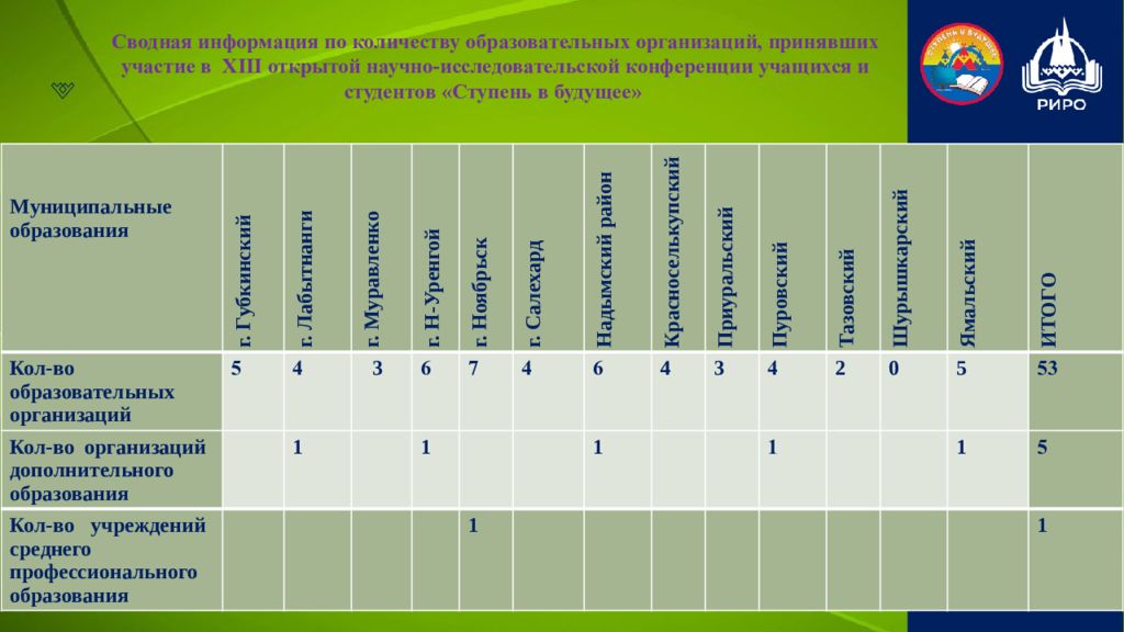 Муниципальные образования г. Губкинский г. Лабытнанги г. Муравленко г. Н-Уренгой г. Ноябрьск г. Салехард Надымский район Красноселькупский Приуральский Пуровский Тазовский Шурышкарский Ямальский ИТОГО Кол- во образовательных организаций 5 4 3 6 7 4 6 4 3 4 2 0 5 53 Кол-во о рганизаций дополнительного образования 1 1 1 1 1 5 Кол-во учреждений среднего профессионального образования 1 1 Сводная информация по количеству образовательных организаций, принявших участие в X I I I открытой научно-исследовательской конференции учащихся и студентов «Ступень в будущее»