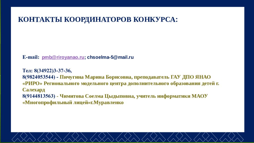 КОНТАКТЫ КООРДИНАТОРОВ КОНКУРСА : E-mail: pmb@riroyanao.ru ; chsoelma-5@mail.ru Тел : 8(34922)3-37-36, 8(9824053544) - Пичугина Марина Борисовна, преподаватель ГАУ ДПО ЯНАО «РИРО» Регионального модельного центра дополнительного образования детей г. Салехард 8(9144813563) - Чимитова Соелма Цыдыповна, учитель информатики МАОУ «Многопрофильный лицей»г.Муравленко