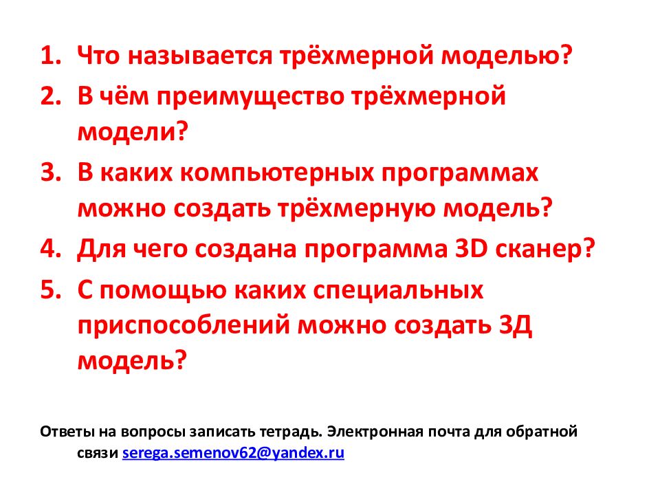 Что называется трёхмерной моделью? В чём преимущество трёхмерной модели? В каких компьютерных программах можно создать трёхмерную модель? Для чего создана программа 3 D сканер? C помощью каких специальных приспособлений можно создать 3Д модель? Ответы на вопросы записать тетрадь. Электронная почта для обратной связи serega.semenov62@yandex.ru