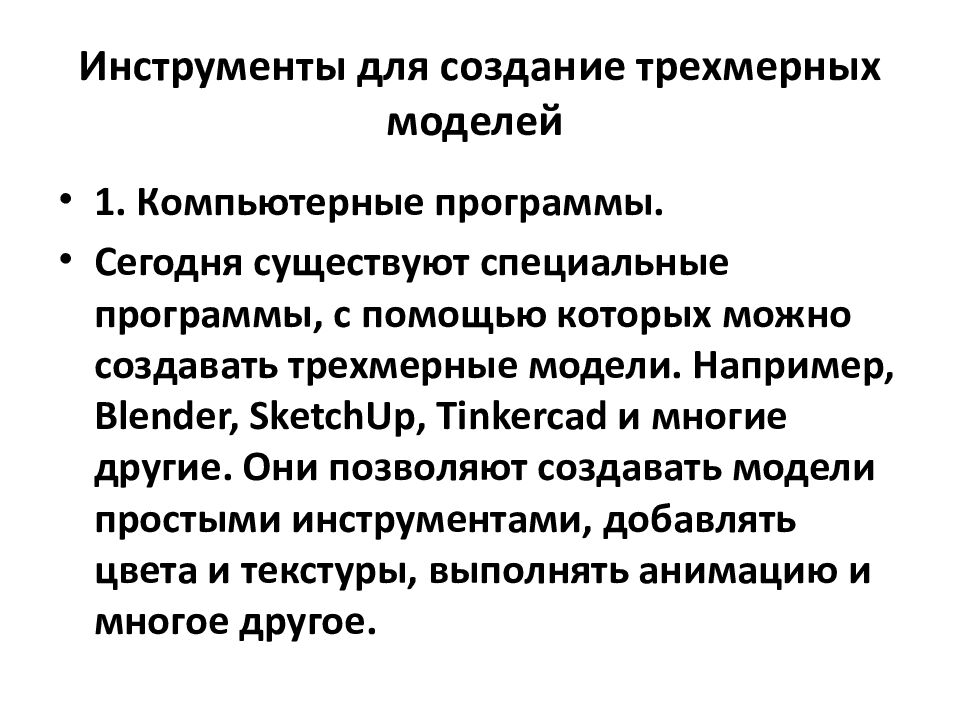 1. Компьютерные программы. Сегодня существуют специальные программы, с помощью которых можно создавать трехмерные модели. Например, Blender, SketchUp, Tinkercad и многие другие. Они позволяют создавать модели простыми инструментами, добавлять цвета и текстуры, выполнять анимацию и многое другое.