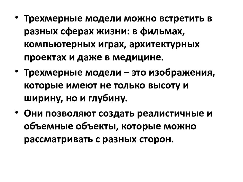 Т рехмерные модели можно встретить в разных сферах жизни: в фильмах, компьютерных играх, архитектурных проектах и даже в медицине. Трехмерные модели – это изображения, которые имеют не только высоту и ширину, но и глубину. Они позволяют создать реалистичные и объемные объекты, которые можно рассматривать с разных сторон.