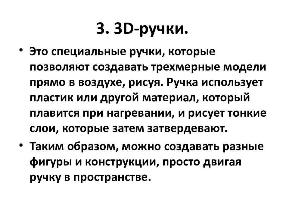 Это специальные ручки, которые позволяют создавать трехмерные модели прямо в воздухе, рисуя. Ручка использует пластик или другой материал, который плавится при нагревании, и рисует тонкие слои, которые затем затвердевают. Таким образом, можно создавать разные фигуры и конструкции, просто двигая ручку в пространстве.