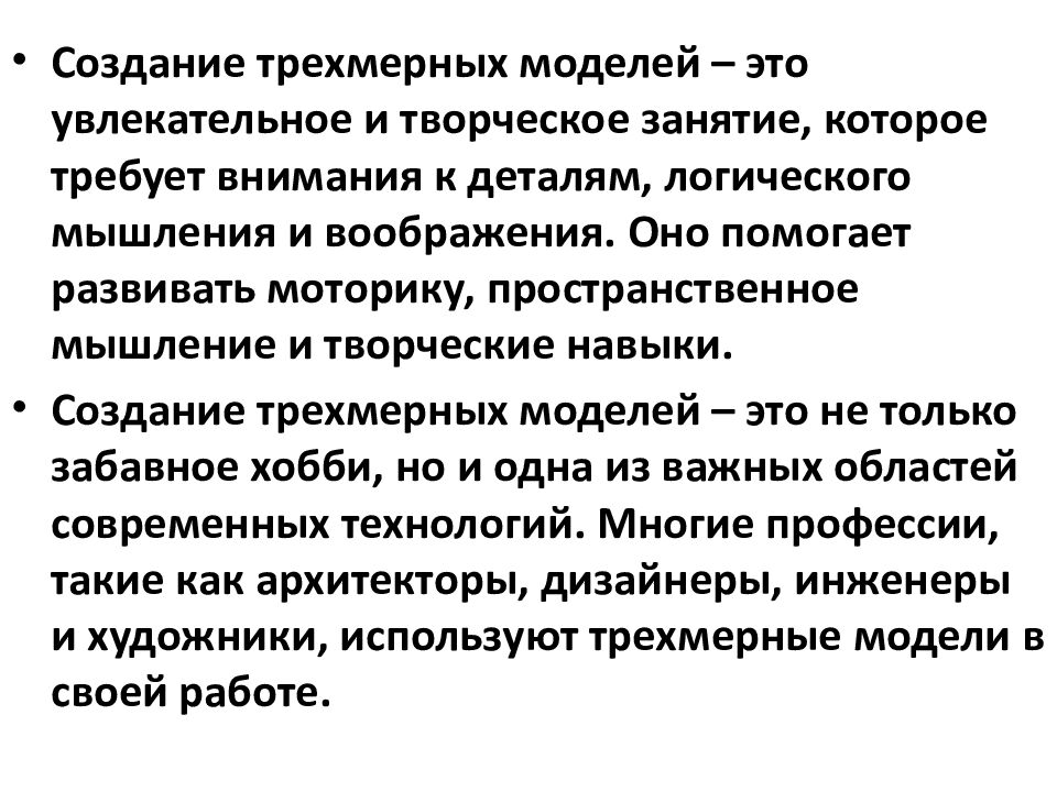 Создание трехмерных моделей – это увлекательное и творческое занятие, которое требует внимания к деталям, логического мышления и воображения. Оно помогает развивать моторику, пространственное мышление и творческие навыки. С оздание трехмерных моделей – это не только забавное хобби, но и одна из важных областей современных технологий. Многие профессии, такие как архитекторы, дизайнеры, инженеры и художники, используют трехмерные модели в своей работе.