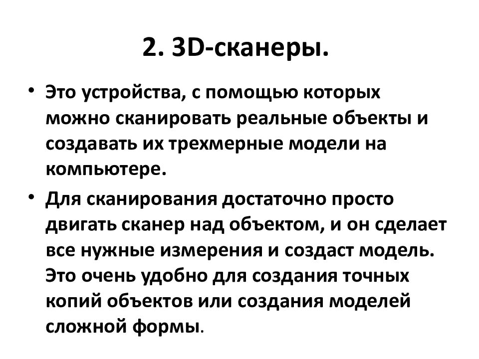 Это устройства, с помощью которых можно сканировать реальные объекты и создавать их трехмерные модели на компьютере. Для сканирования достаточно просто двигать сканер над объектом, и он сделает все нужные измерения и создаст модель. Это очень удобно для создания точных копий объектов или создания моделей сложной формы.