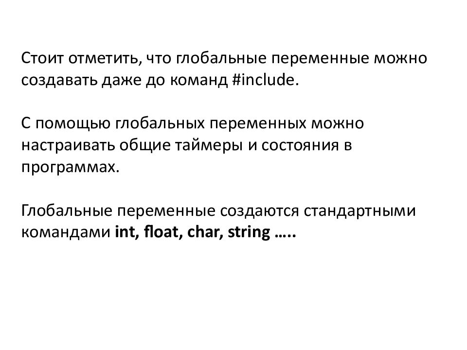Стоит отметить, что глобальные переменные можно создавать даже до команд #include. С помощью глобальных переменных можно настраивать общие таймеры и состояния в программах. Глобальные переменные создаются стандартными командами int, float, char, string …..