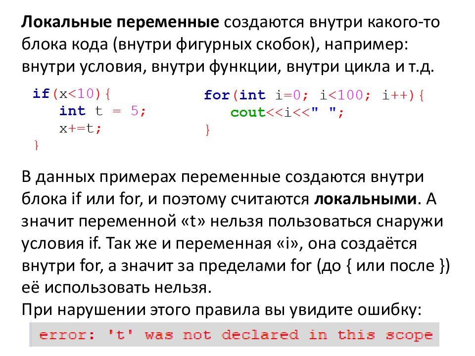 Локальные переменные создаются внутри какого-то блока кода (внутри фигурных скобок), например: внутри условия, внутри функции, внутри цикла и т.д. В данных примерах переменные создаются внутри блока if или for, и поэтому считаются локальными. А значит переменной « t » нельзя пользоваться снаружи условия if. Так же и переменная « i », она создаётся внутри for, а значит за пределами for (до { или после } ) её использовать нельзя. При нарушении этого правила вы увидите ошибку: