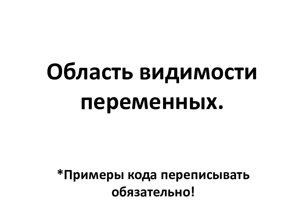 Последний слайд презентации: Область видимости переменных. *Примеры кода переписывать обязательно!