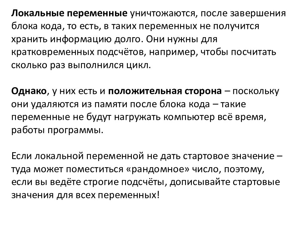 Локальные переменные уничтожаются, после завершения блока кода, то есть, в таких переменных не получится хранить информацию долго. Они нужны для кратковременных подсчётов, например, чтобы посчитать сколько раз выполнился цикл. Однако, у них есть и положительная сторона – поскольку они удаляются из памяти после блока кода – такие переменные не будут нагружать компьютер всё время, работы программы. Если локальной переменной не дать стартовое значение – туда может поместиться « рандомное » число, поэтому, если вы ведёте строгие подсчёты, дописывайте стартовые значения для всех переменных!