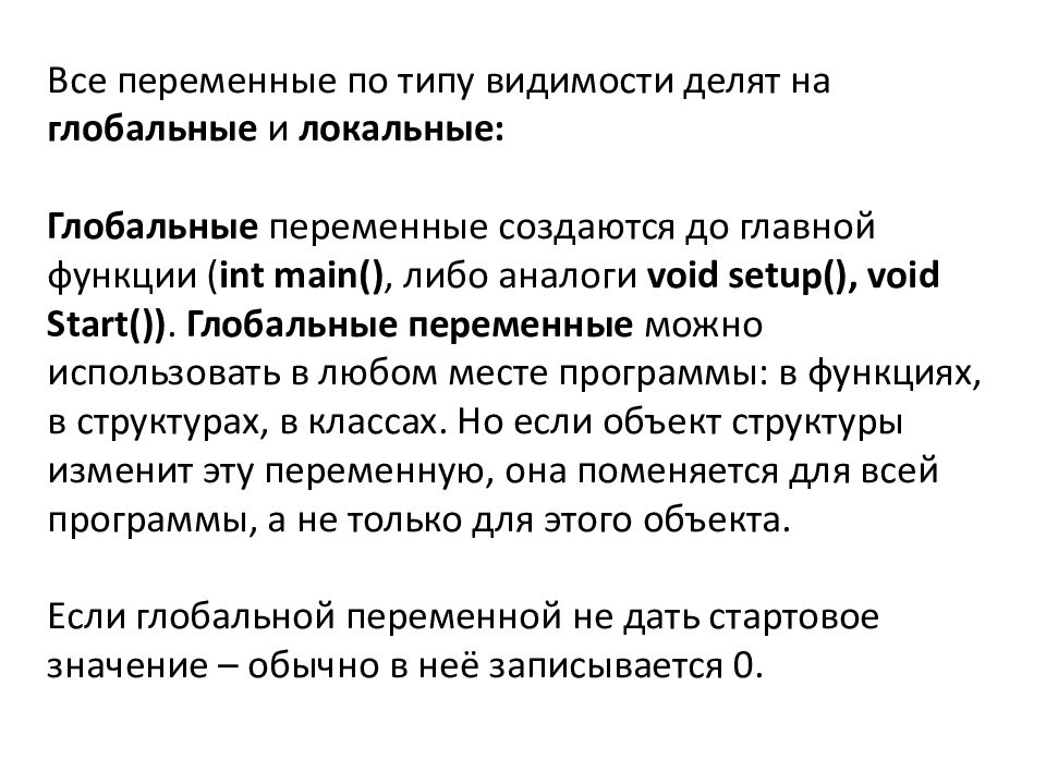 Все переменные по типу видимости делят на глобальные и локальные: Глобальные переменные создаются до главной функции ( int main(), либо аналоги void setup(), void Start() ). Глобальные переменные можно использовать в любом месте программы: в функциях, в структурах, в классах. Но если объект структуры изменит эту переменную, она поменяется для всей программы, а не только для этого объекта. Если глобальной переменной не дать стартовое значение – обычно в неё записывается 0.