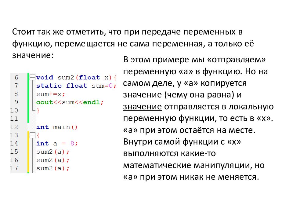 Стоит так же отметить, что при передаче переменных в функцию, перемещается не сама переменная, а только её значение: В этом примере мы «отправляем» переменную «а» в функцию. Но на самом деле, у «а» копируется значение (чему она равна) и значение отправляется в локальную переменную функции, то есть в «х». «а» при этом остаётся на месте. Внутри самой функции с «х» выполняются какие-то математические манипуляции, но «а» при этом никак не меняется.