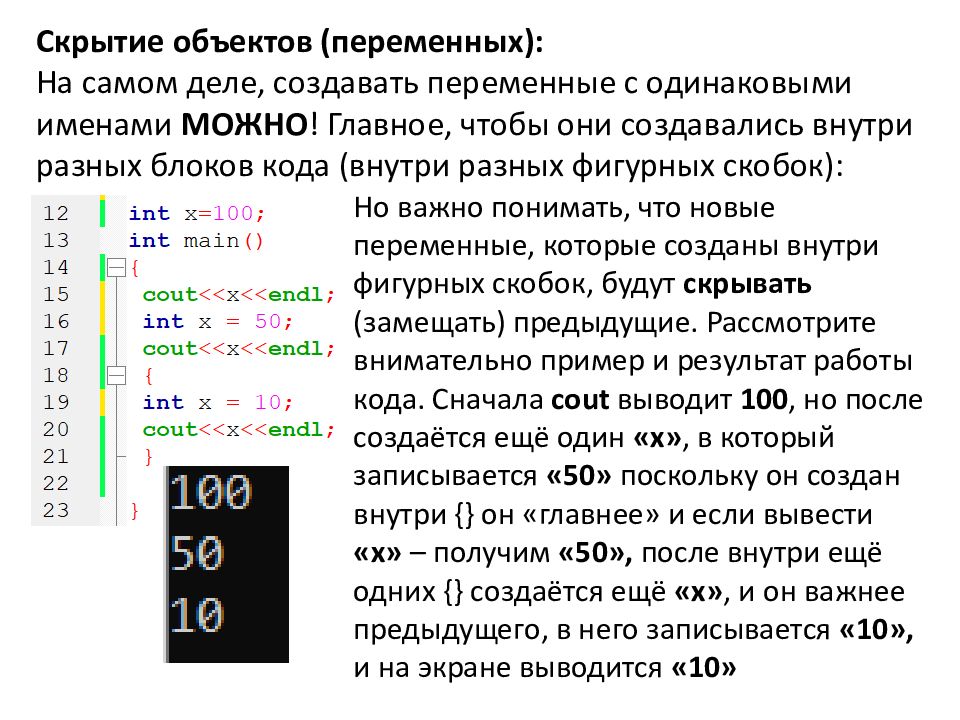 Скрытие объектов (переменных): На самом деле, создавать переменные с одинаковыми именами МОЖНО ! Главное, чтобы они создавались внутри разных блоков кода (внутри разных фигурных скобок): Но важно понимать, что новые переменные, которые созданы внутри фигурных скобок, будут скрывать (замещать) предыдущие. Рассмотрите внимательно пример и результат работы кода. Сначала cout выводит 100, но после создаётся ещё один «х», в который записывается «50» поскольку он создан внутри {} он «главнее» и если вывести «х» – получим «50», после внутри ещё одних {} создаётся ещё «х», и он важнее предыдущего, в него записывается «10», и на экране выводится «10»