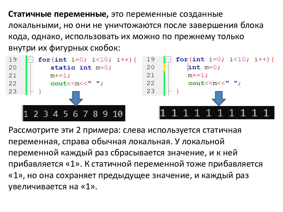 Статичные переменные, это переменные созданные локальными, но они не уничтожаются после завершения блока кода, однако, использовать их можно по прежнему только внутри их фигурных скобок: Рассмотрите эти 2 примера: слева используется статичная переменная, справа обычная локальная. У локальной переменной каждый раз сбрасывается значение, и к ней прибавляется « 1 ». К статичной переменной тоже прибавляется «1», но она сохраняет предыдущее значение, и каждый раз увеличивается на «1».