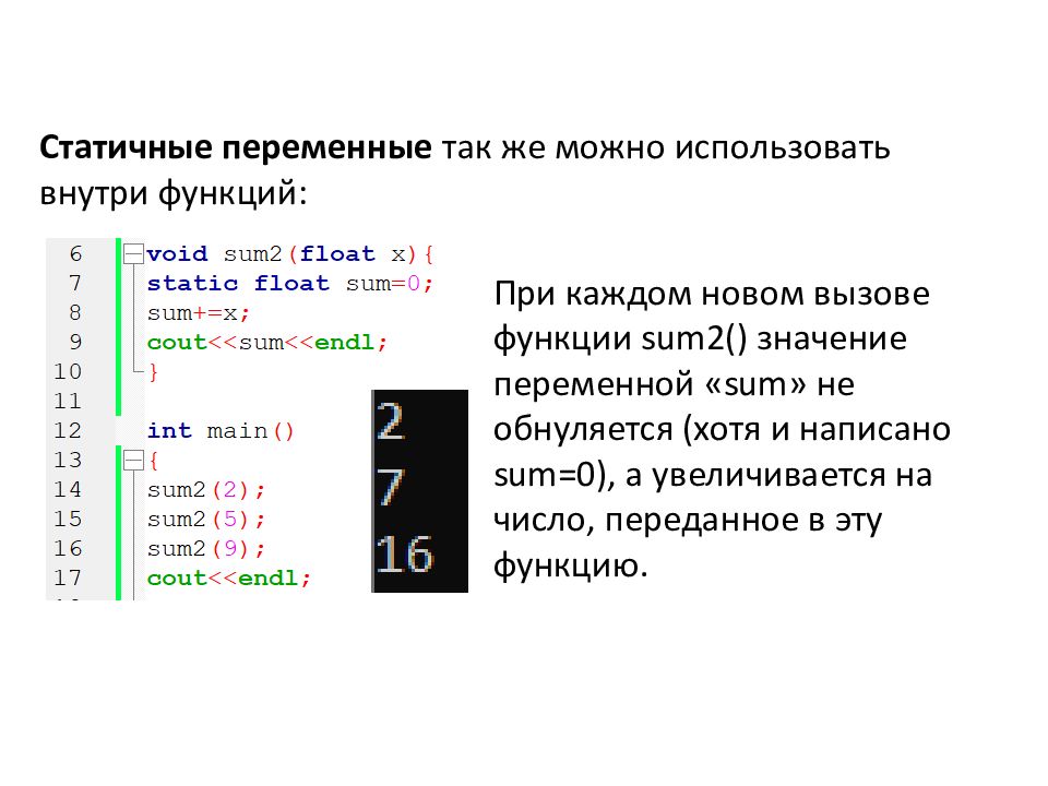 Статичные переменные так же можно использовать внутри функций: При каждом новом вызове функции sum2 () значение переменной « sum » не обнуляется (хотя и написано sum=0 ), а увеличивается на число, переданное в эту функцию.