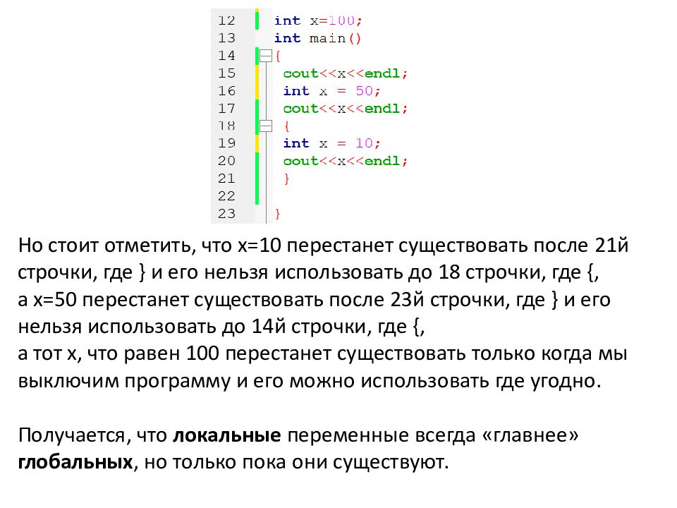 Но стоит отметить, что х=10 перестанет существовать после 21й строчки, где } и его нельзя использовать до 18 строчки, где {, а х=50 перестанет существовать после 23й строчки, где } и его нельзя использовать до 14й строчки, где {, а тот х, что равен 100 перестанет существовать только когда мы выключим программу и его можно использовать где угодно. Получается, что локальные переменные всегда «главнее» глобальных, но только пока они существуют.