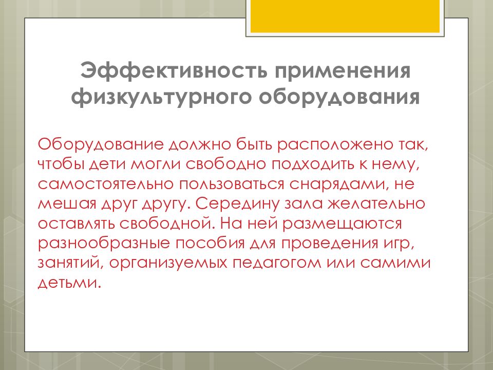 Оборудование должно быть расположено так, чтобы дети могли свободно подходить к нему, самостоятельно пользоваться снарядами, не мешая друг другу. Середину зала желательно оставлять свободной. На ней размещаются разнообразные пособия для проведения игр, занятий, организуемых педагогом или самими детьми.