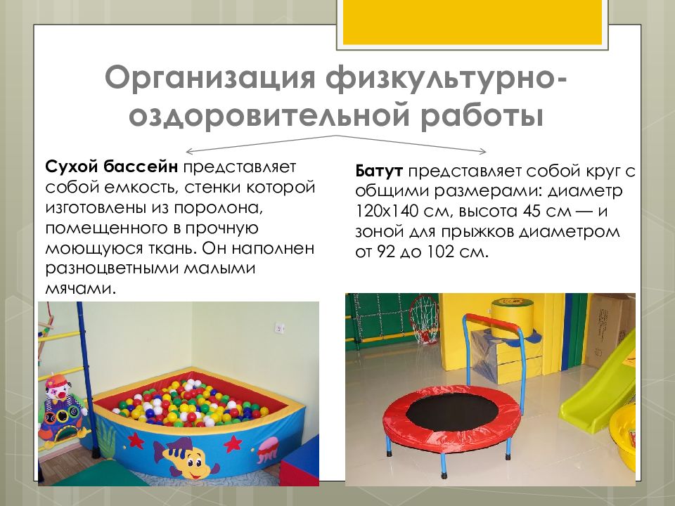 Сухой бассейн представляет собой емкость, стенки которой изготовлены из поролона, помещенного в прочную моющуюся ткань. Он наполнен разноцветными малыми мячами. Батут представляет собой круг с общими размерами: диаметр 120x140 см, высота 45 см — и зоной для прыжков диаметром от 92 до 102 см.