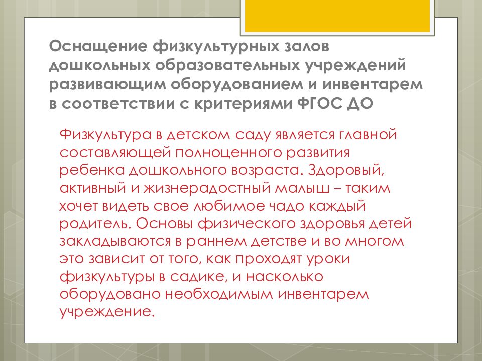 Физкультура в детском саду является главной составляющей полноценного развития ребенка дошкольного возраста. Здоровый, активный и жизнерадостный малыш – таким хочет видеть свое любимое чадо каждый родитель. Основы физического здоровья детей закладываются в раннем детстве и во многом это зависит от того, как проходят уроки физкультуры в садике, и насколько оборудовано необходимым инвентарем учреждение.