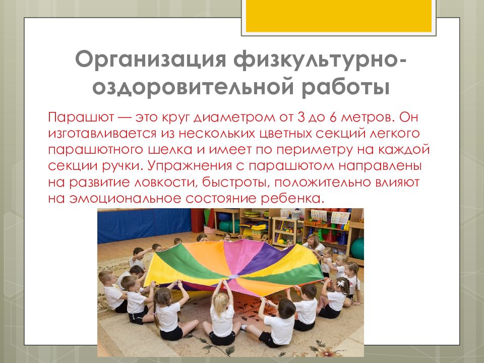 Парашют — это круг диаметром от 3 до 6 метров. Он изготавливается из нескольких цветных секций легкого парашютного шелка и имеет по периметру на каждой секции ручки. Упражнения с парашютом направлены на развитие ловкости, быстроты, положительно влияют на эмоциональное состояние ребенка.