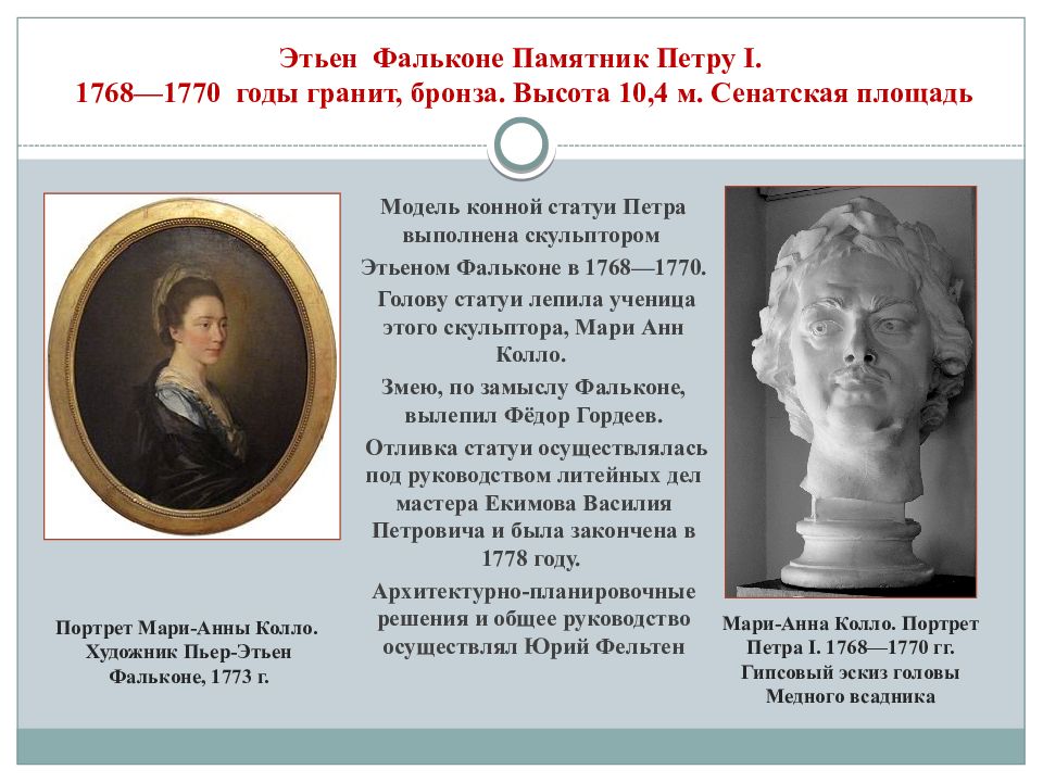 Модель конной статуи Петра выполнена скульптором Этьеном Фальконе в 1768—1770. Голову статуи лепила ученица этого скульптора, Мари Анн Колло. Змею, по замыслу Фальконе, вылепил Фёдор Гордеев. Отливка статуи осуществлялась под руководством литейных дел мастера Екимова Василия Петровича и была закончена в 1778 году. Архитектурно-планировочные решения и общее руководство осуществлял Юрий Фельтен Мари-Анна Колло. Портрет Петра I. 1768—1770 гг. Гипсовый эскиз головы Медного всадника Портрет Мари-Анны Колло. Художник Пьер- Этьен Фальконе, 1773 г.