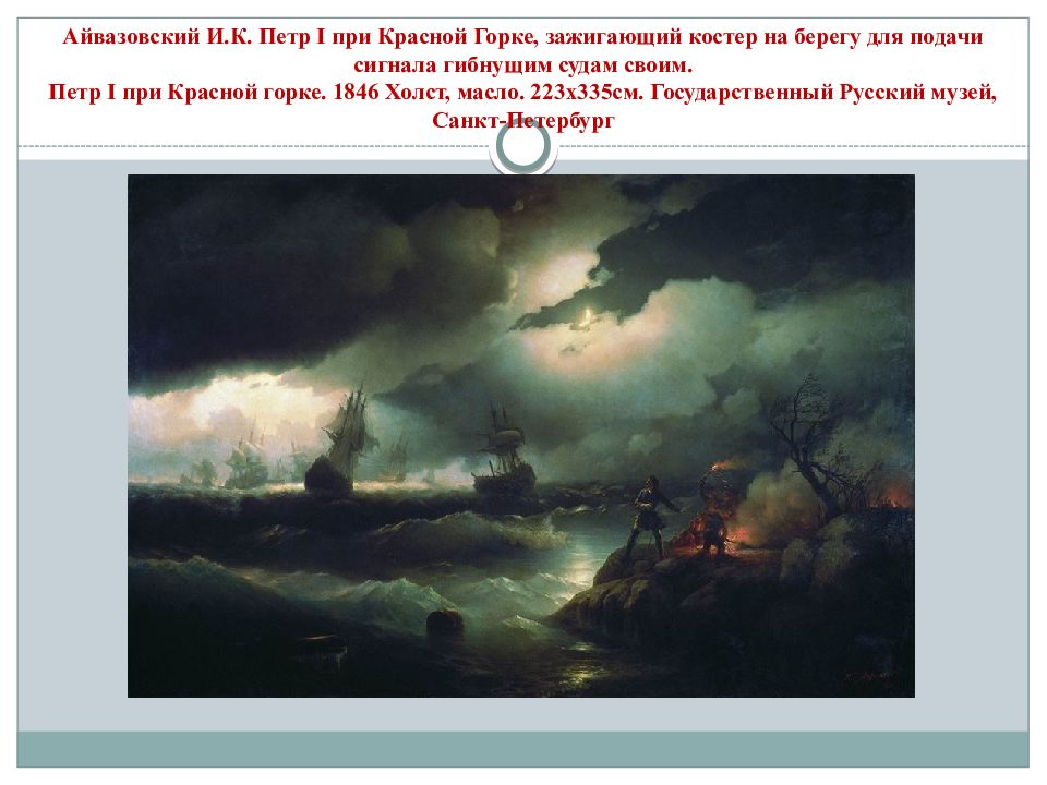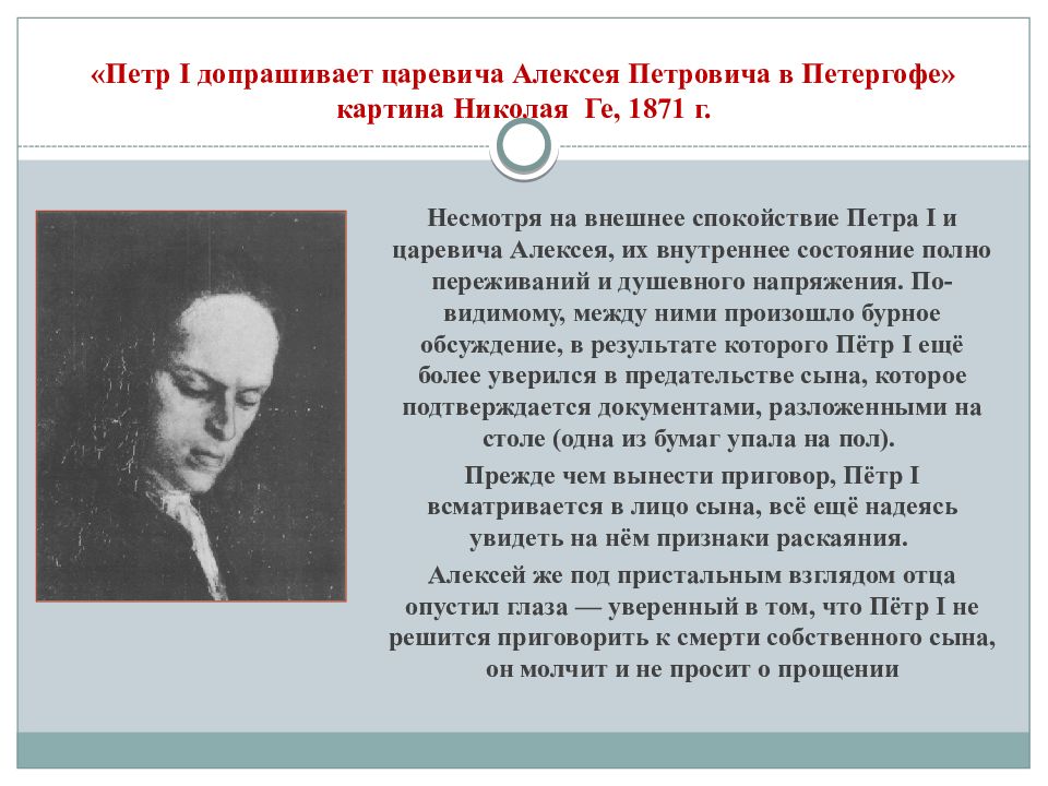 Слайд 46: Пётр I допрашивает царевича Алексея Петровича в Петергофе» — картина русского художника Николая Ге (1831—1894), написанная в 1871 году. Она является частью собрания Государственной Третьяковской галереи Размер картины — 135,7 × 173 картина Николая Ге, 1871 г