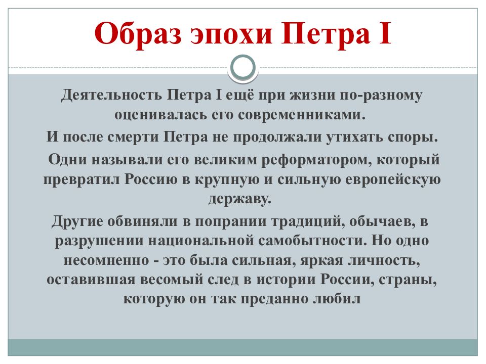 Деятельность Петра I ещё при жизни по-разному оценивалась его современниками. И после смерти Петра не продолжали утихать споры. Одни называли его великим реформатором, который превратил Россию в крупную и сильную европейскую державу. Другие обвиняли в попрании традиций, обычаев, в разрушении национальной самобытности. Но одно несомненно - это была сильная, яркая личность, оставившая весомый след в истории России, страны, которую он так преданно любил