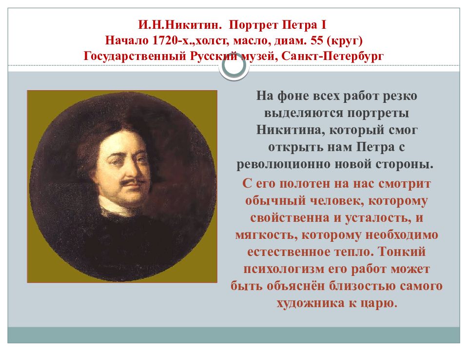 На фоне всех работ резко выделяются портреты Никитина, который смог открыть нам Петра с революционно новой стороны. С его полотен на нас смотрит обычный человек, которому свойственна и усталость, и мягкость, которому необходимо естественное тепло. Тонкий психологизм его работ может быть объяснён близостью самого художника к царю.
