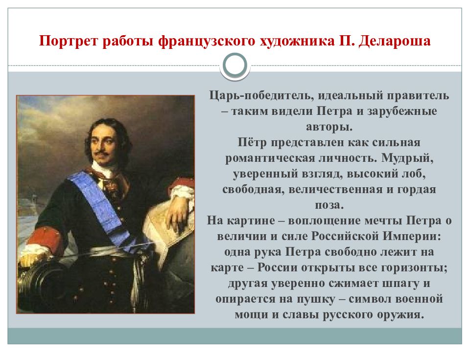 Царь-победитель, идеальный правитель – таким видели Петра и зарубежные авторы. Пётр представлен как сильная романтическая личность. Мудрый, уверенный взгляд, высокий лоб, свободная, величественная и гордая поза. На картине – воплощение мечты Петра о величии и силе Российской Империи: одна рука Петра свободно лежит на карте – России открыты все горизонты; другая уверенно сжимает шпагу и опирается на пушку – символ военной мощи и славы русского оружия.