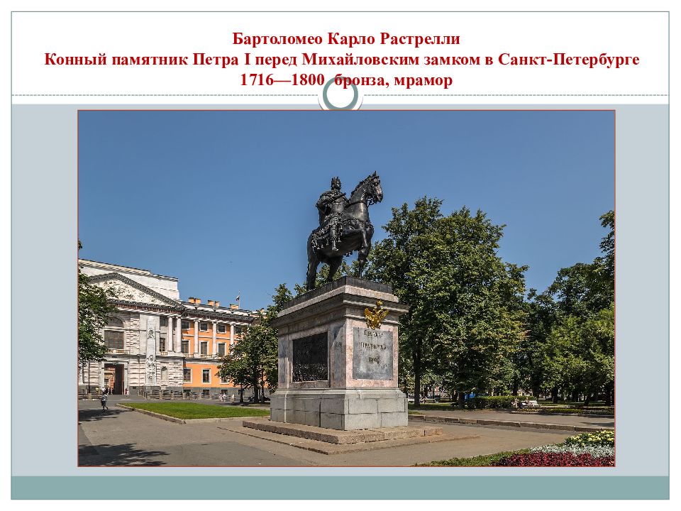 Слайд 18: Бартоломео Карло Растрелли Конный памятник Петра I перед Михайловским замком в Санкт-Петербурге 1716—1800 бронза, мрамор