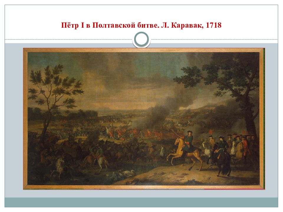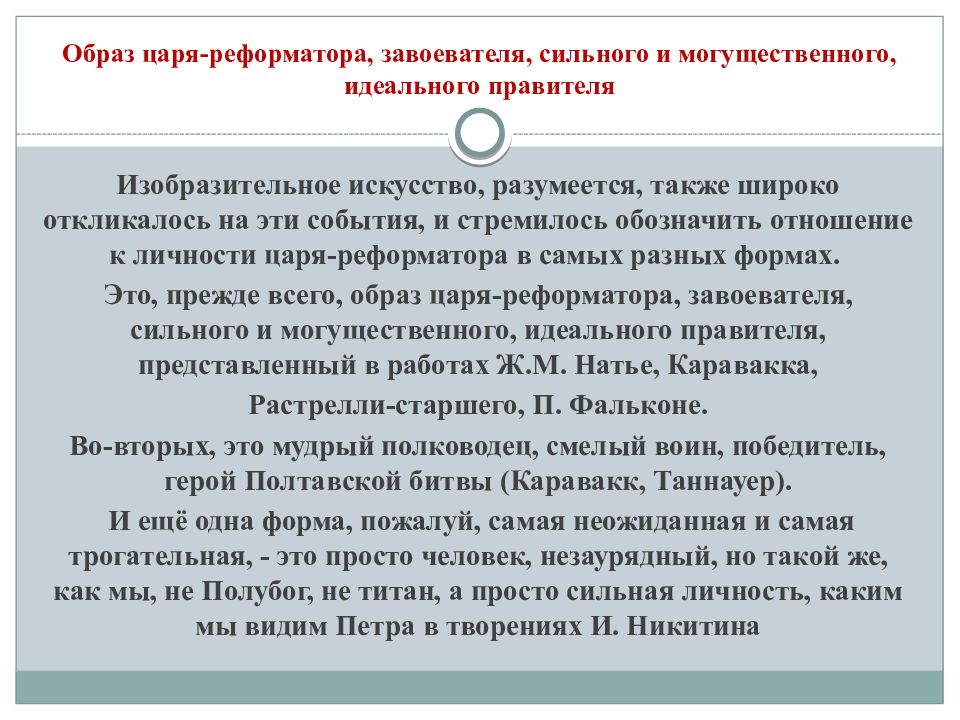 Изобразительное искусство, разумеется, также широко откликалось на эти события, и стремилось обозначить отношение к личности царя-реформатора в самых разных формах. Это, прежде всего, образ царя-реформатора, завоевателя, сильного и могущественного, идеального правителя, представленный в работах Ж.М. Натье, Каравакка, Растрелли-старшего, П. Фальконе. Во-вторых, это мудрый полководец, смелый воин, победитель, герой Полтавской битвы ( Каравакк, Таннауер ). И ещё одна форма, пожалуй, самая неожиданная и самая трогательная, - это просто человек, незаурядный, но такой же, как мы, не Полубог, не титан, а просто сильная личность, каким мы видим Петра в творениях И. Никитина