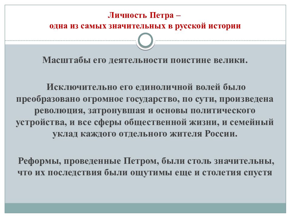 Масштабы его деятельности поистине велики. Исключительно его единоличной волей было преобразовано огромное государство, по сути, произведена революция, затронувшая и основы политического устройства, и все сферы общественной жизни, и семейный уклад каждого отдельного жителя России. Реформы, проведенные Петром, были столь значительны, что их последствия были ощутимы еще и столетия спустя