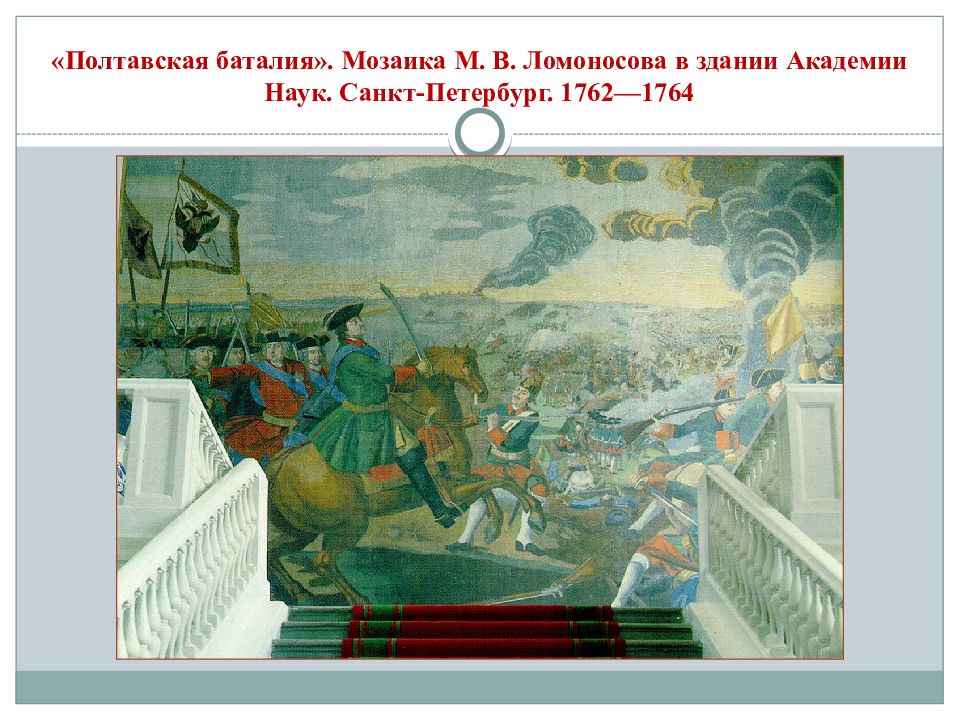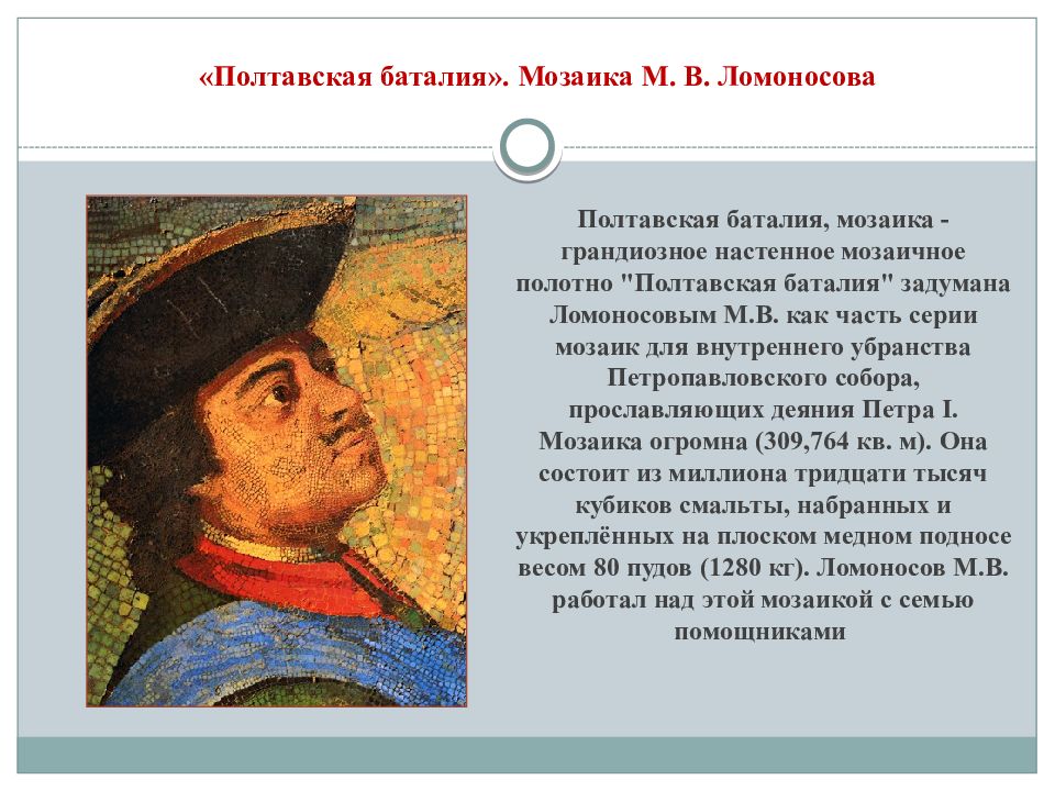 Полтавская баталия, мозаика - грандиозное настенное мозаичное полотно "Полтавская баталия" задумана Ломоносовым М.В. как часть серии мозаик для внутреннего убранства Петропавловского собора, прославляющих деяния Петра I. Мозаика огромна (309,764 кв. м). Она состоит из миллиона тридцати тысяч кубиков смальты, набранных и укреплённых на плоском медном подносе весом 80 пудов (1280 кг). Ломоносов М.В. работал над этой мозаикой с семью помощниками