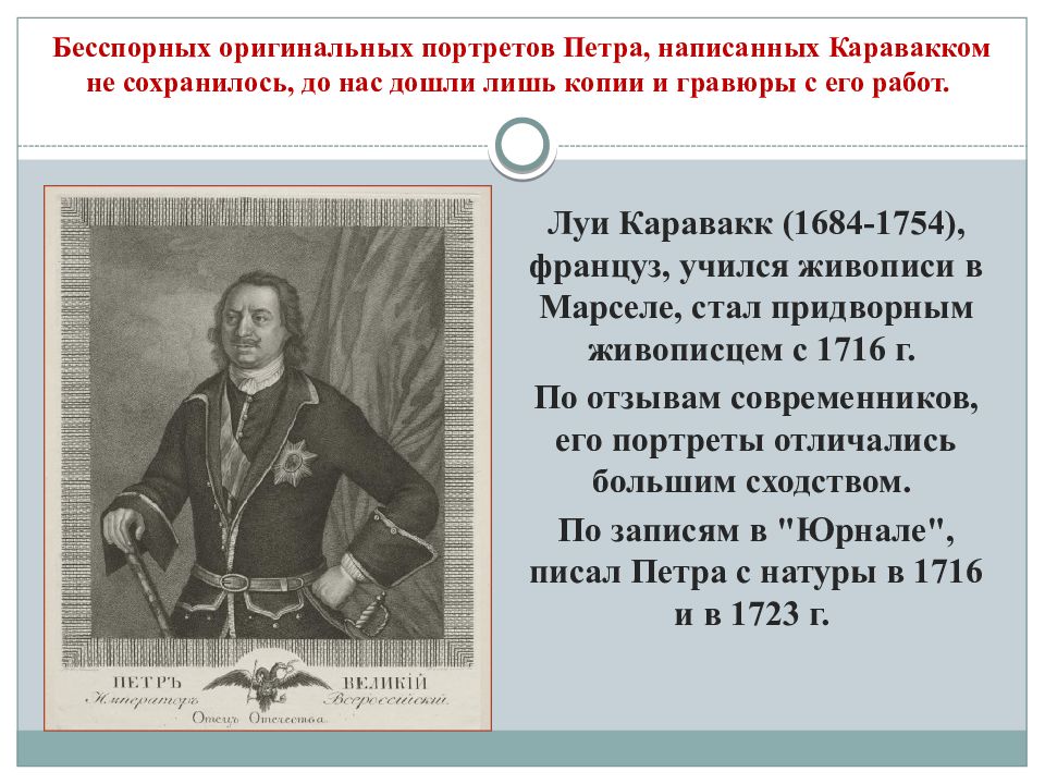 Слайд 11: Бесспорных оригинальных портретов Петра, написанных Каравакком не сохранилось, до нас дошли лишь копии и гравюры с его работ