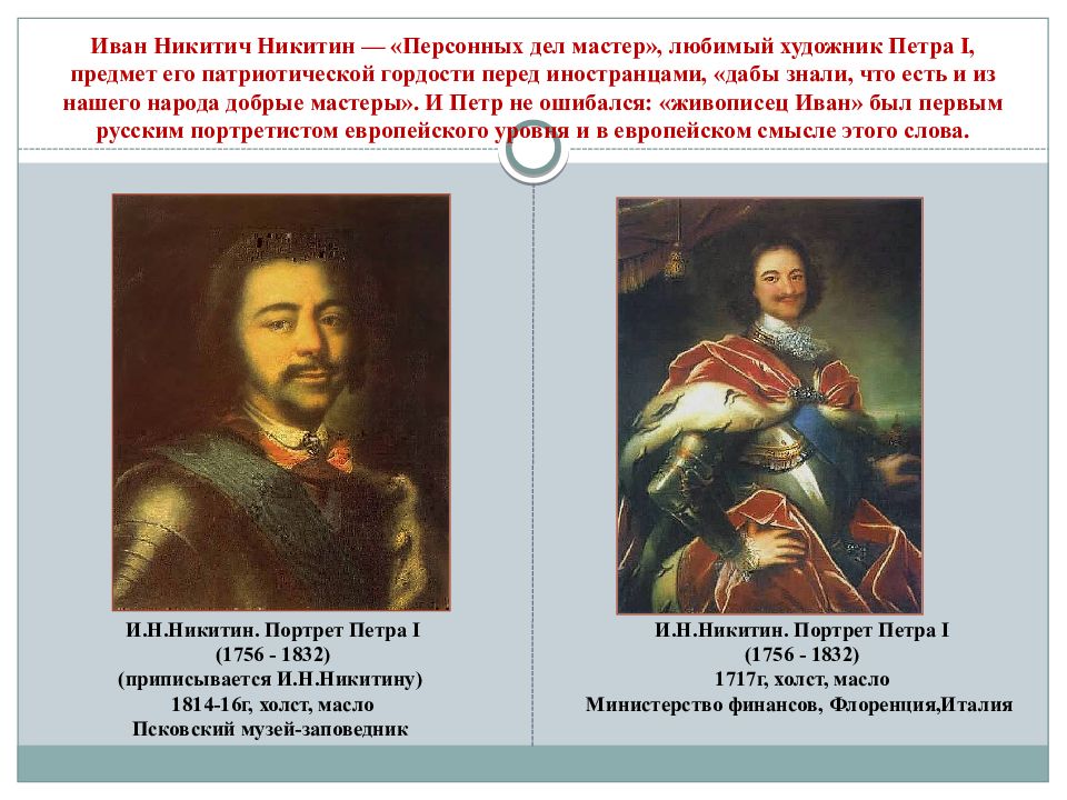 И.Н.Никитин. Портрет Петра I (1756 - 1832 ) (приписывается И.Н.Никитину) 1814-16г, холст, масло Псковский музей-заповедник И.Н.Никитин. Портрет Петра I (1756 - 1832 ) 1717г, холст, масло Министерство финансов, Флоренция,Италия