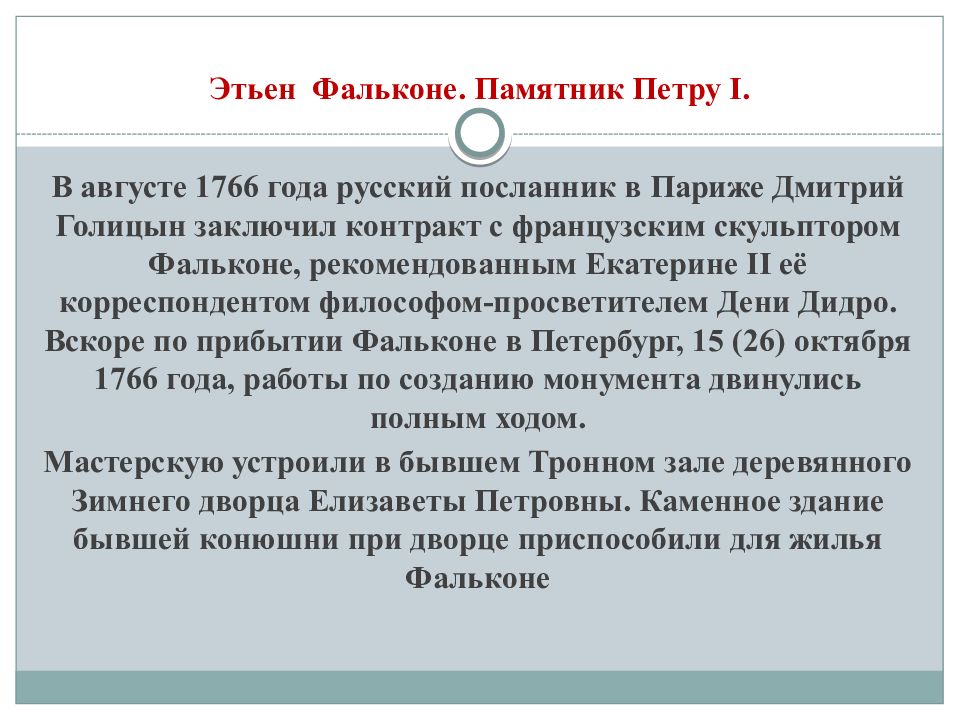В августе 1766 года русский посланник в Париже Дмитрий Голицын заключил контракт с французским скульптором Фальконе, рекомендованным Екатерине II её корреспондентом философом-просветителем Дени Дидро. Вскоре по прибытии Фальконе в Петербург, 15 (26) октября 1766 года, работы по созданию монумента двинулись полным ходом. Мастерскую устроили в бывшем Тронном зале деревянного Зимнего дворца Елизаветы Петровны. Каменное здание бывшей конюшни при дворце приспособили для жилья Фальконе