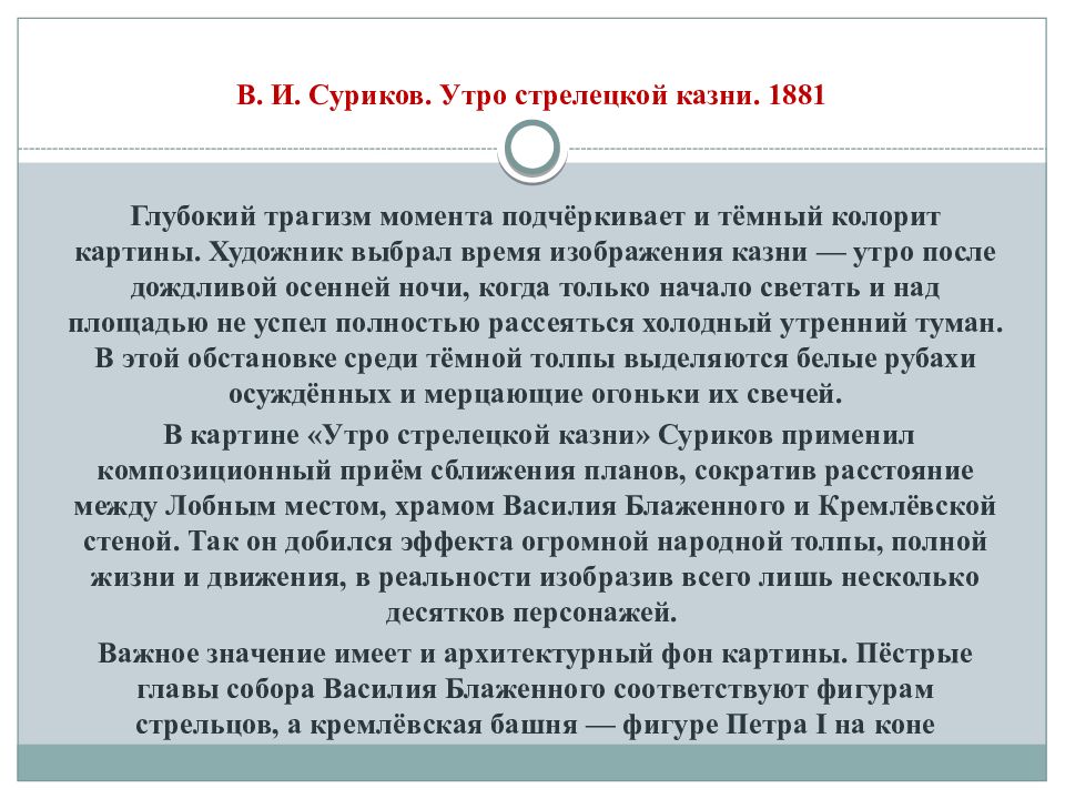 Глубокий трагизм момента подчёркивает и тёмный колорит картины. Художник выбрал время изображения казни — утро после дождливой осенней ночи, когда только начало светать и над площадью не успел полностью рассеяться холодный утренний туман. В этой обстановке среди тёмной толпы выделяются белые рубахи осуждённых и мерцающие огоньки их свечей. В картине «Утро стрелецкой казни» Суриков применил композиционный приём сближения планов, сократив расстояние между Лобным местом, храмом Василия Блаженного и Кремлёвской стеной. Так он добился эффекта огромной народной толпы, полной жизни и движения, в реальности изобразив всего лишь несколько десятков персонажей. Важное значение имеет и архитектурный фон картины. Пёстрые главы собора Василия Блаженного соответствуют фигурам стрельцов, а кремлёвская башня — фигуре Петра I на коне