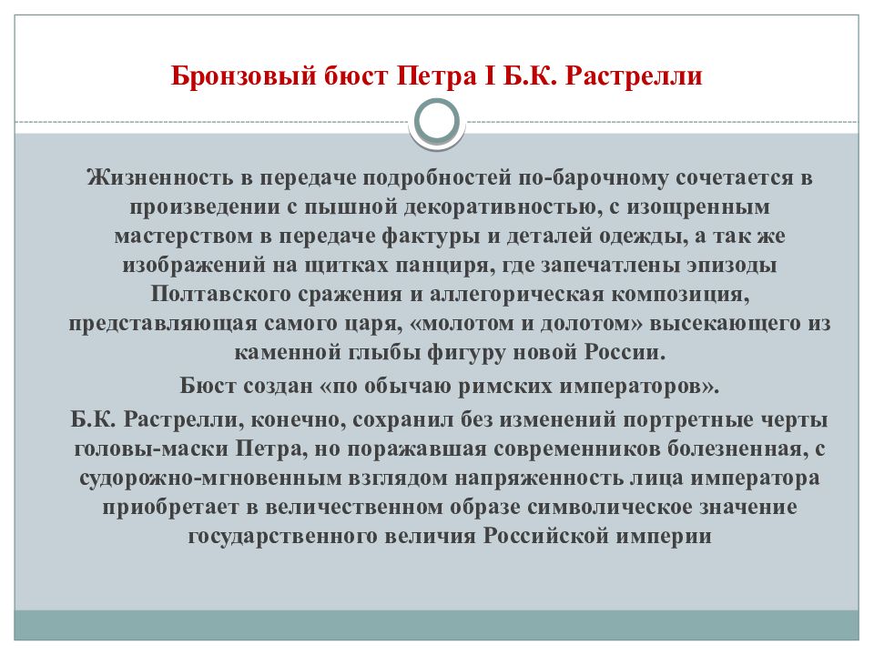 Жизненность в передаче подробностей по-барочному сочетается в произведении с пышной декоративностью, с изощренным мастерством в передаче фактуры и деталей одежды, а так же изображений на щитках панциря, где запечатлены эпизоды Полтавского сражения и аллегорическая композиция, представляющая самого царя, «молотом и долотом» высекающего из каменной глыбы фигуру новой России. Бюст создан «по обычаю римских императоров». Б.К. Растрелли, конечно, сохранил без изменений портретные черты головы-маски Петра, но поражавшая современников болезненная, с судорожно-мгновенным взглядом напряженность лица императора приобретает в величественном образе символическое значение государственного величия Российской империи