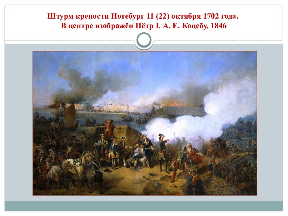 Слайд 41: Штурм крепости Нотебург 11 (22) октября 1702 года. В центре изображён Пётр I. А. Е. Коцебу, 1846