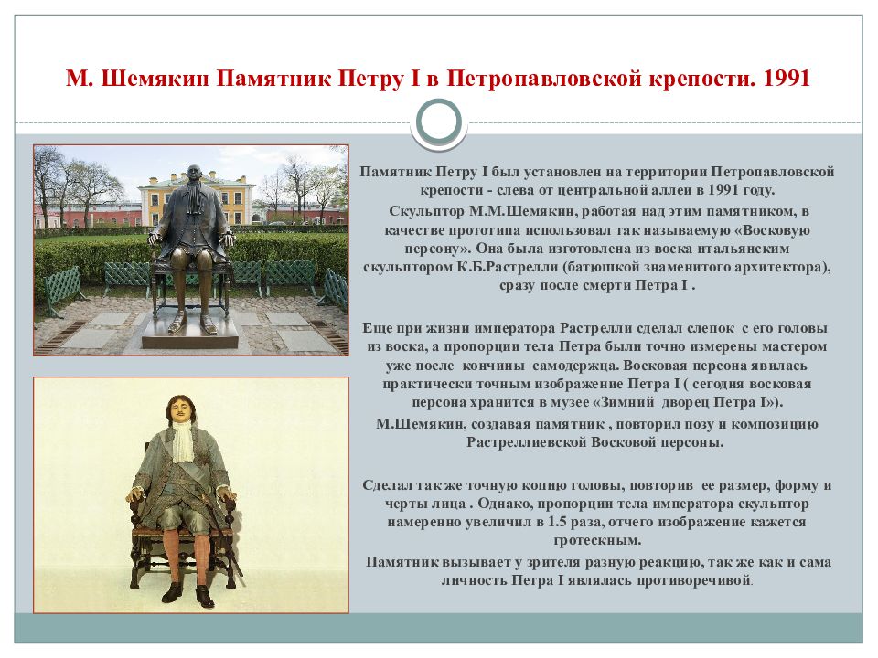 Памятник Петру I был установлен на территории Петропавловской крепости - слева от центральной аллеи в 1991 году. Скульптор М.М.Шемякин, работая над этим памятником, в качестве прототипа использовал так называемую «Восковую персону». Она была изготовлена из воска итальянским скульптором К.Б.Растрелли (батюшкой знаменитого архитектора), сразу после смерти Петра I. Еще при жизни императора Растрелли сделал слепок с его головы из воска, а пропорции тела Петра были точно измерены мастером уже после кончины самодержца. Восковая персона явилась практически точным изображение Петра I ( сегодня восковая персона хранится в музее «Зимний дворец Петра I »). М.Шемякин, создавая памятник, повторил позу и композицию Растреллиевской Восковой персоны. Сделал так же точную копию головы, повторив ее размер, форму и черты лица. Однако, пропорции тела императора скульптор намеренно увеличил в 1.5 раза, отчего изображение кажется гротескным. Памятник вызывает у зрителя разную реакцию, так же как и сама личность Петра I являлась противоречивой.