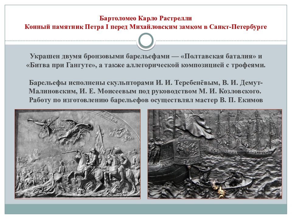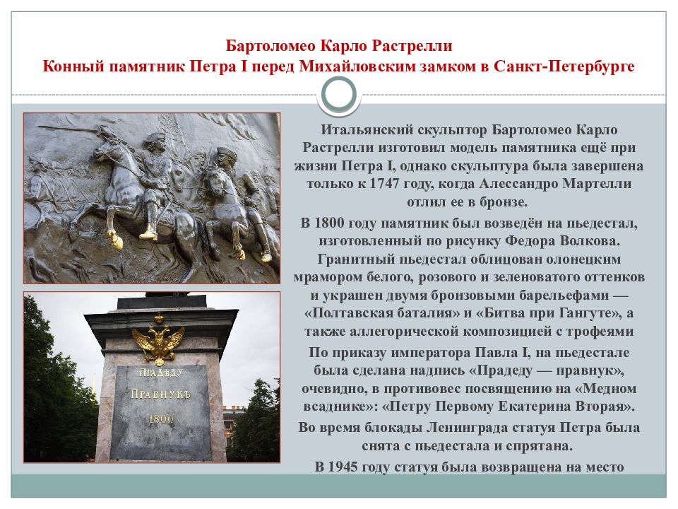 Слайд 20: Бартоломео Карло Растрелли Конный памятник Петра I перед Михайловским замком в Санкт-Петербурге