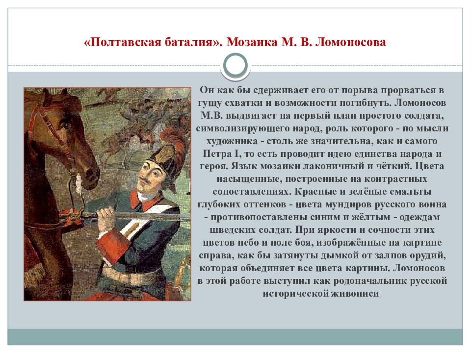 Он как бы сдерживает его от порыва прорваться в гущу схватки и возможности погибнуть. Ломоносов М.В. выдвигает на первый план простого солдата, символизирующего народ, роль которого - по мысли художника - столь же значительна, как и самого Петра I, то есть проводит идею единства народа и героя. Язык мозаики лаконичный и чёткий. Цвета насыщенные, построенные на контрастных сопоставлениях. Красные и зелёные смальты глубоких оттенков - цвета мундиров русского воина - противопоставлены синим и жёлтым - одеждам шведских солдат. При яркости и сочности этих цветов небо и поле боя, изображённые на картине справа, как бы затянуты дымкой от залпов орудий, которая объединяет все цвета картины. Ломоносов в этой работе выступил как родоначальник русской исторической живописи