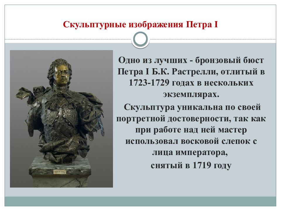 Одно из лучших - бронзовый бюст Петра I Б.К. Растрелли, отлитый в 1723-1729 годах в нескольких экземплярах. Скульптура уникальна по своей портретной достоверности, так как при работе над ней мастер использовал восковой слепок с лица императора, снятый в 1719 году