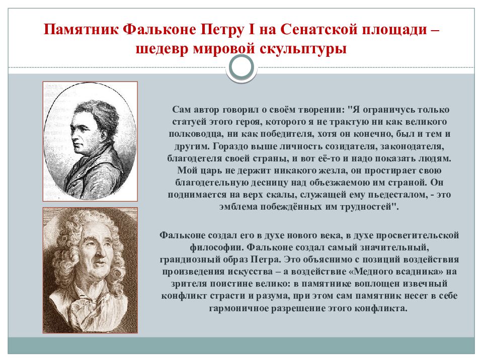 Сам автор говорил о своём творении: "Я ограничусь только статуей этого героя, которого я не трактую ни как великого полководца, ни как победителя, хотя он конечно, был и тем и другим. Гораздо выше личность созидателя, законодателя, благодетеля своей страны, и вот её-то и надо показать людям. Мой царь не держит никакого жезла, он простирает свою благодетельную десницу над объезжаемою им страной. Он поднимается на верх скалы, служащей ему пьедесталом, - это эмблема побеждённых им трудностей ". Фальконе создал его в духе нового века, в духе просветительской философии. Фальконе создал самый значительный, грандиозный образ Петра. Это объяснимо с позиций воздействия произведения искусства – а воздействие «Медного всадника» на зрителя поистине велико: в памятнике воплощен извечный конфликт страсти и разума, при этом сам памятник несет в себе гармоничное разрешение этого конфликта.